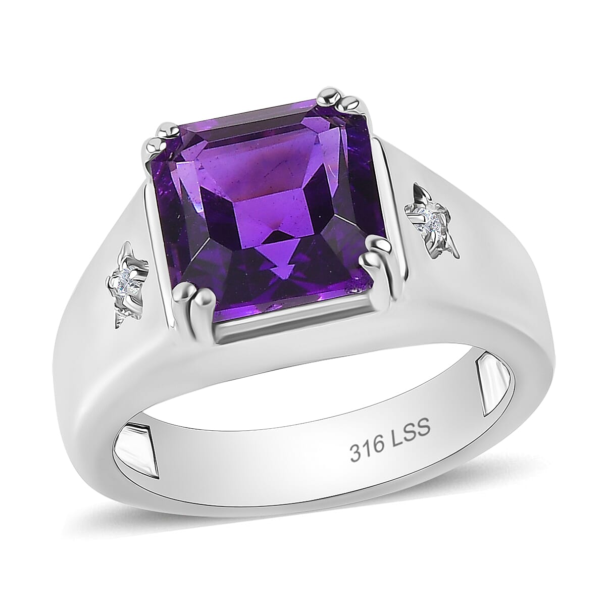 African Amethyst and White Zircon 5.10 ctw Men's Ring in Stainless Steel (Size 11.0)