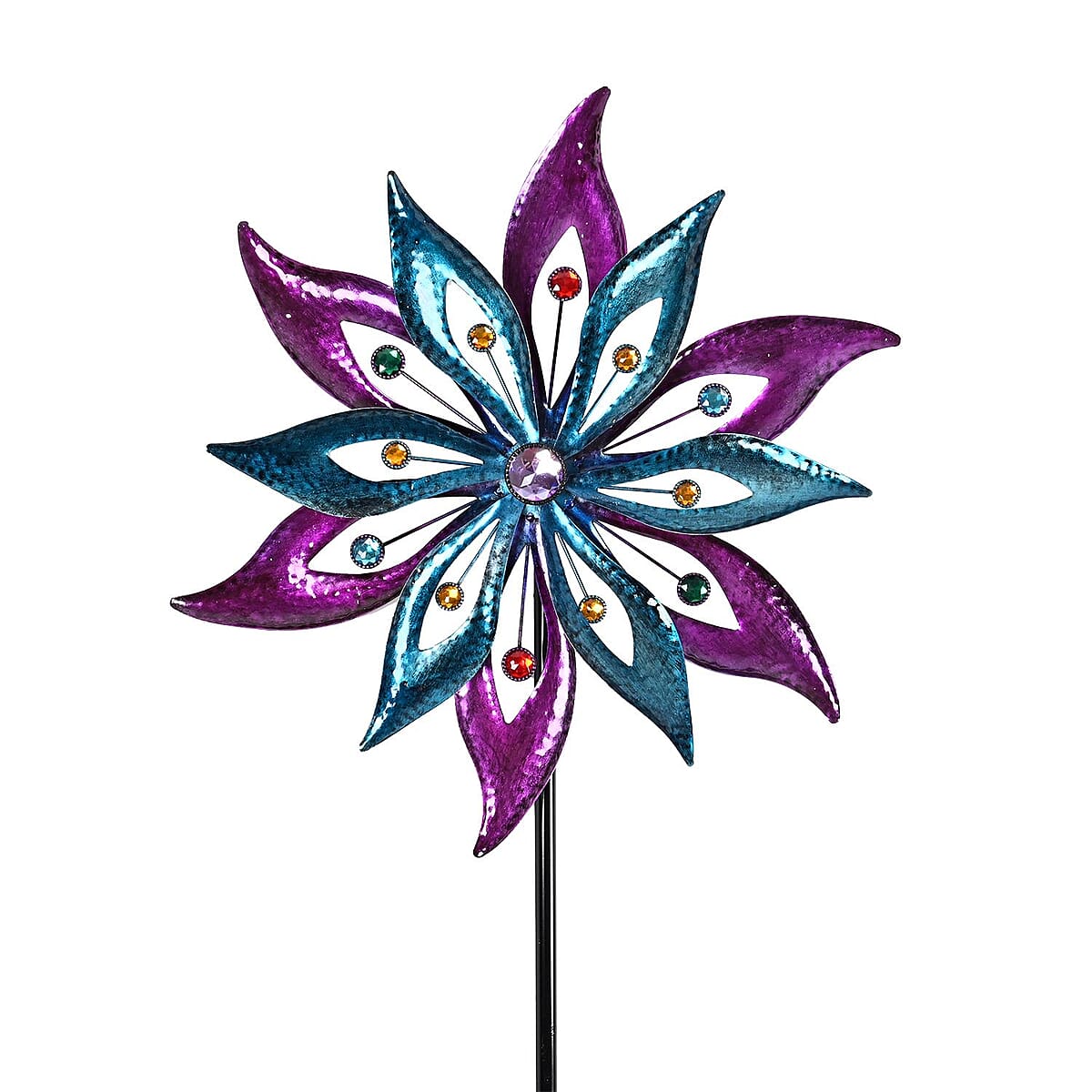 Introducing the Alpine floral wind spinner garden stake, a stunning addition to any outdoor space. This garden stake features a beautiful floral design that comes to life with the gentlest breeze, creating a mesmerizing and calming effect. Crafted with high-quality materials, this decorative garden stake is built to withstand the elements and stand the test of time. The colorful gemstones add a touch of brilliance and sparkle that catches the eye and reflects the sunlight, creating a dazzling visual display. Measuring 64 inches in height, this lawn stake is the perfect size to place in your flower bed, patio, or backyard.