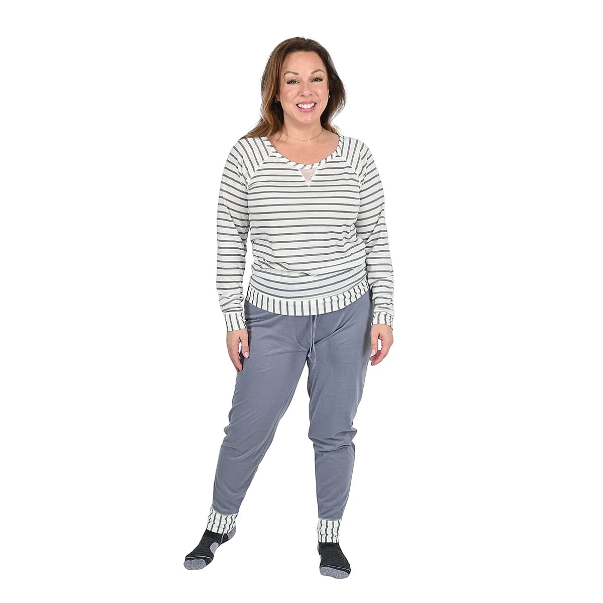 The striped pajama set from Amanda Paige is a cozy and stylish sleepwear option designed for maximum comfort. The set includes a top with a round neckline and medium-length sleeves, and matching pants with an elastic waistband. The striped design adds a classic touch to the overall look, while the soft and breathable fabric provides a comfortable and relaxed fit. The elastic waistband ensures a snug and comfortable fit without being too tight, allowing for easy movement during sleep. The pajama set is perfect for lounging around the house or for a comfortable night's sleep. Its versatile design allows for easy mixing and matching with other sleepwear pieces, making it a practical addition to any sleepwear collection.