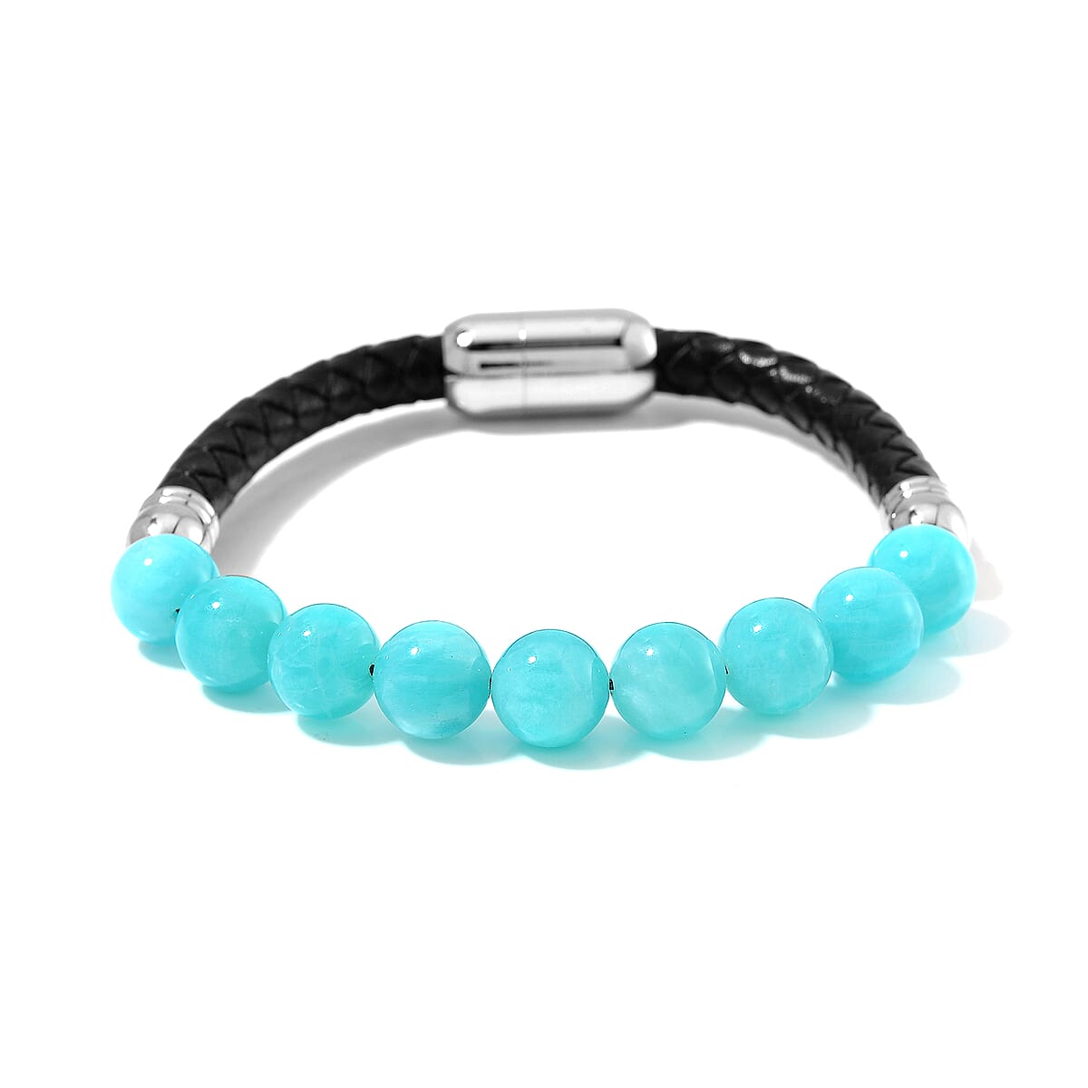 Amazonite 50.00 ctw Leather Cord Bracelet in Stainless Steel (7.75 In)