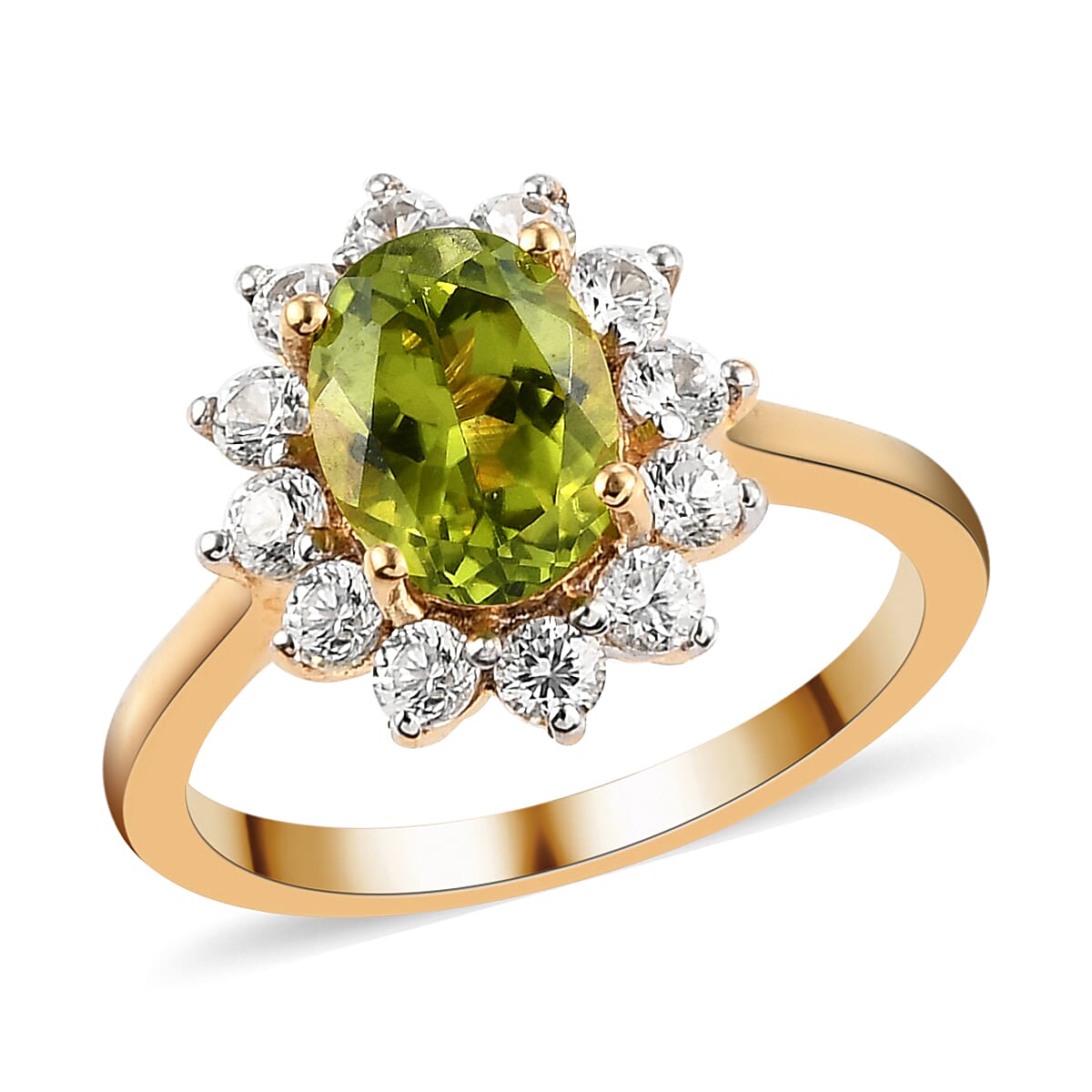 AMERICAN Natural Arizona Peridot and White Zircon Sunburst Ring in Vermeil Yellow Gold Over Sterling Silver (Size 7.0) 2.20 ctw