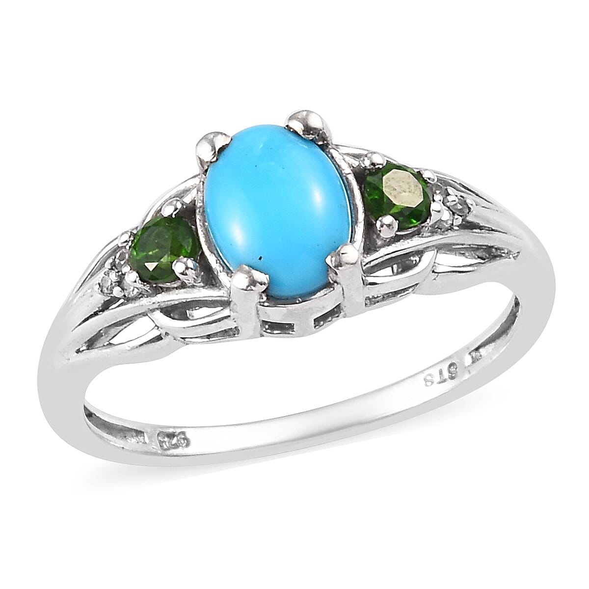 Sparkling with multi gemstones, this natural Sleeping Beauty turquoise ring is a combo of design, spark, and classy look. Gleaming in the blue hues, the oval-shaped natural Sleeping turquoise is graced with colorful rounds on both sides, completing the design. The swirling smooth sleek frames beautifully hold the designer forefront. Crafted in platinum plated sterling silver, this solitaire turquoise ring is gleaming and luminous. Named after a mountain, the bright, cheerful robin's egg blue color of Sleeping Beauty turquoise makes it one of the most sought-after varieties of this trendsetting stone.