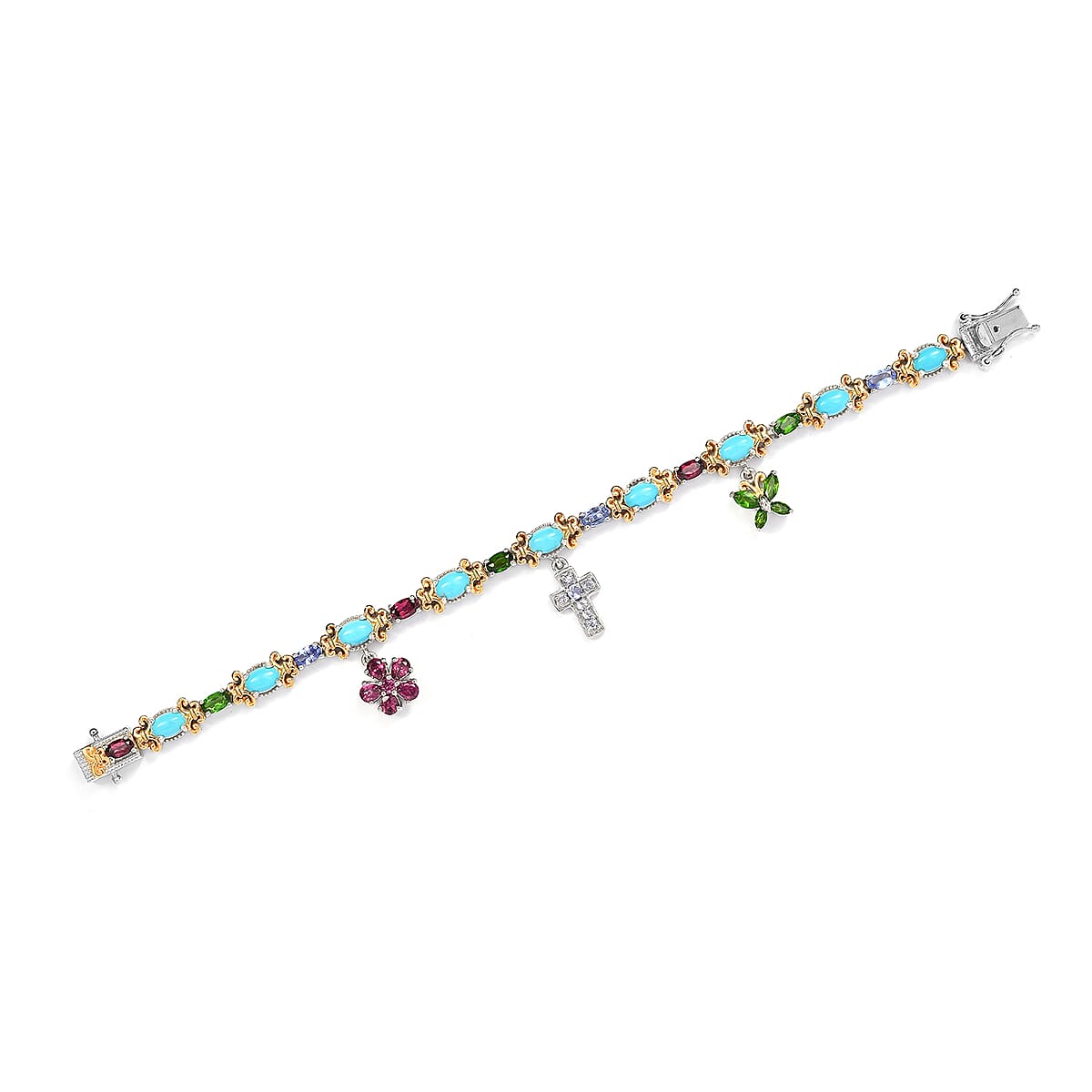 AMERICAN Natural Sleeping Beauty Turquoise, Multi Gemstone Bracelet with Charm in Vermeil YG and Platinum Over Sterling Silver (7.25 In) 16.90 Grams 8.50 ctw