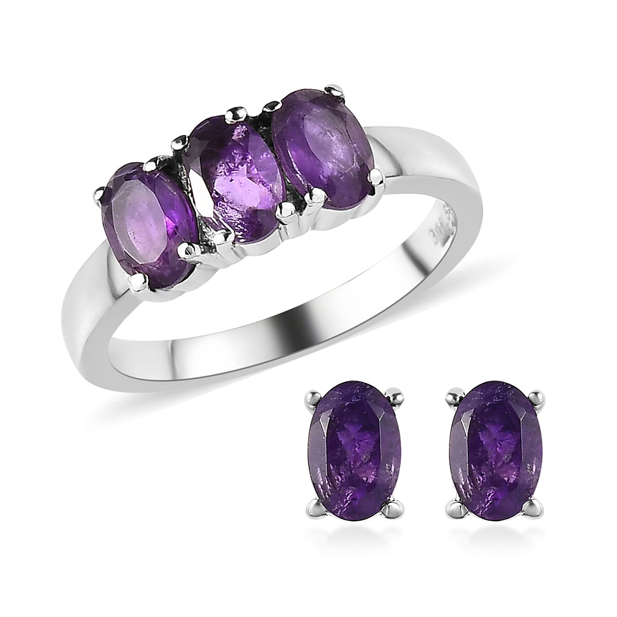 Amethyst 3 Stone Ring (Size 8.0) and Solitaire Stud Earrings in Stainless Steel 2.20 ctw