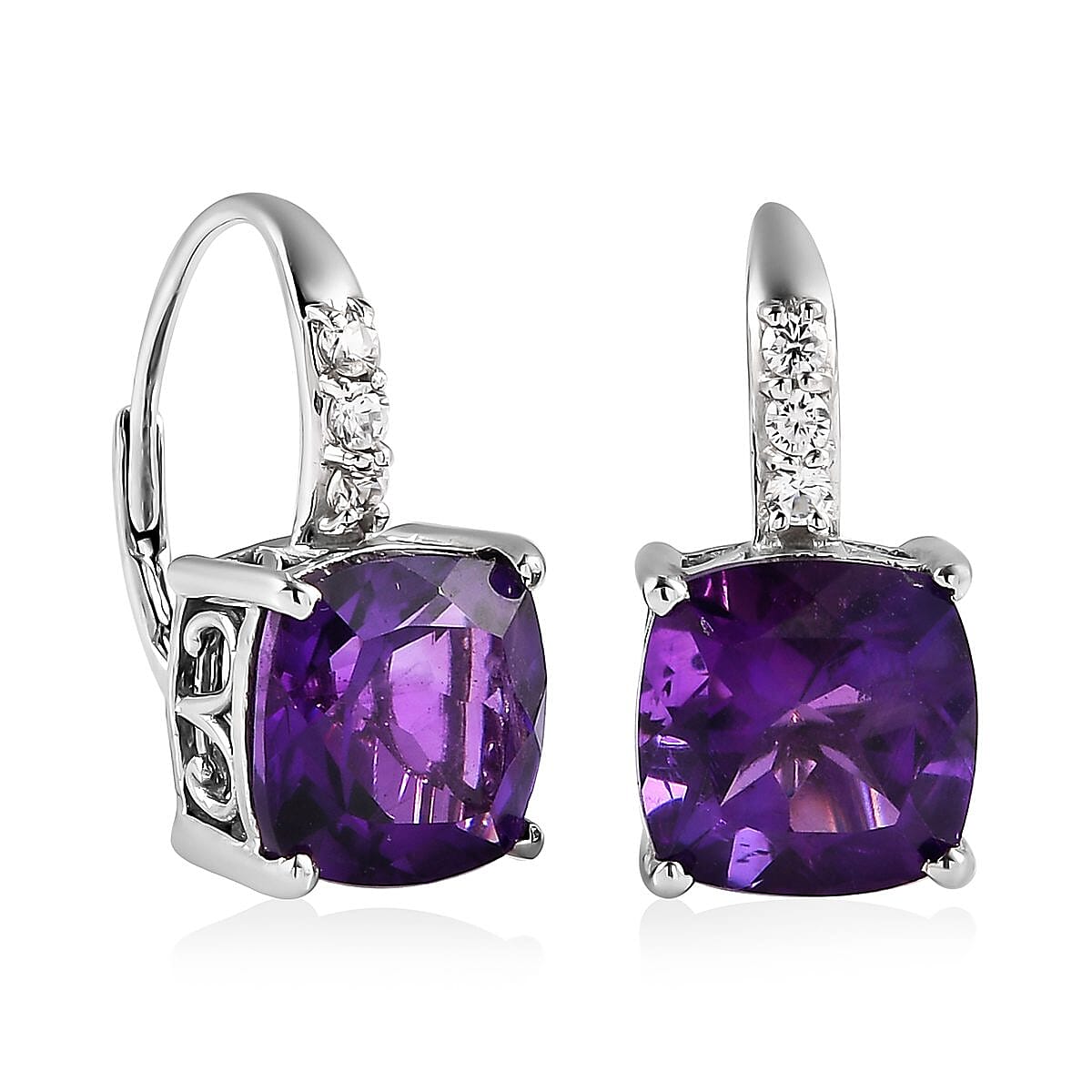 Amethyst and Natural White Zircon Lever Back Earrings in Platinum Over Sterling Silver 8.15 ctw