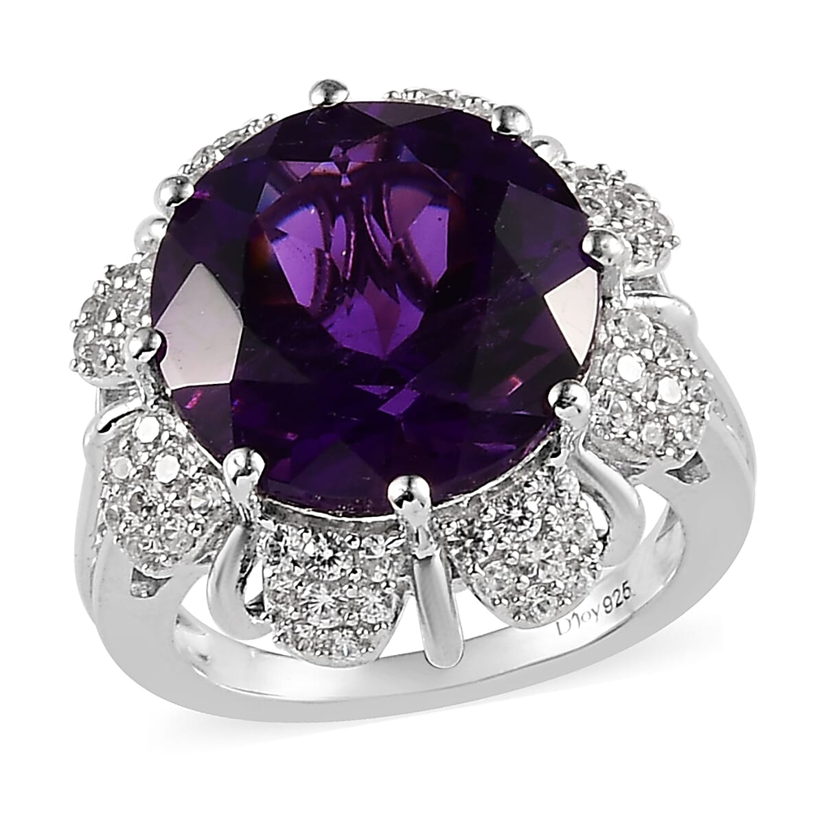A petunia flower inspires this amethyst ring signifying friendship and respect. This amethyst floral ring is crafted in sterling silver. This sterling silver ring features a beautiful round amethyst gem surrounded by sparkling white zircons arranged in a floral pattern. The combination of the stones and the intricate floral design makes this ring the perfect classic and feminine style.