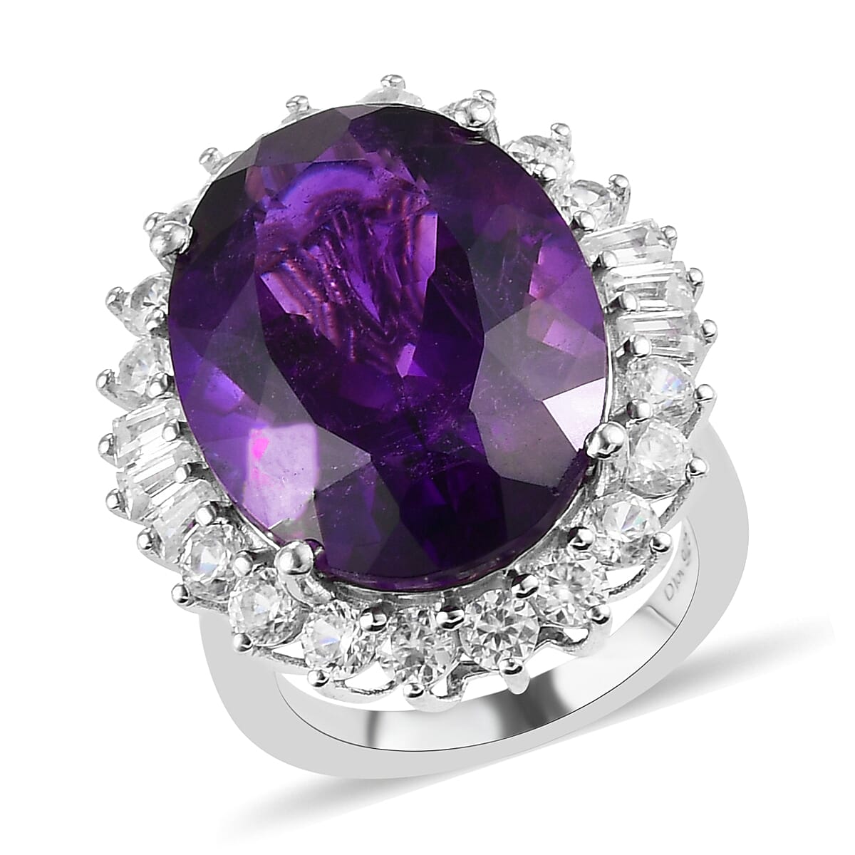 Amethyst and White Zircon Halo Ring in Platinum Over Sterling Silver (Size 6.0) 19.10 ctw