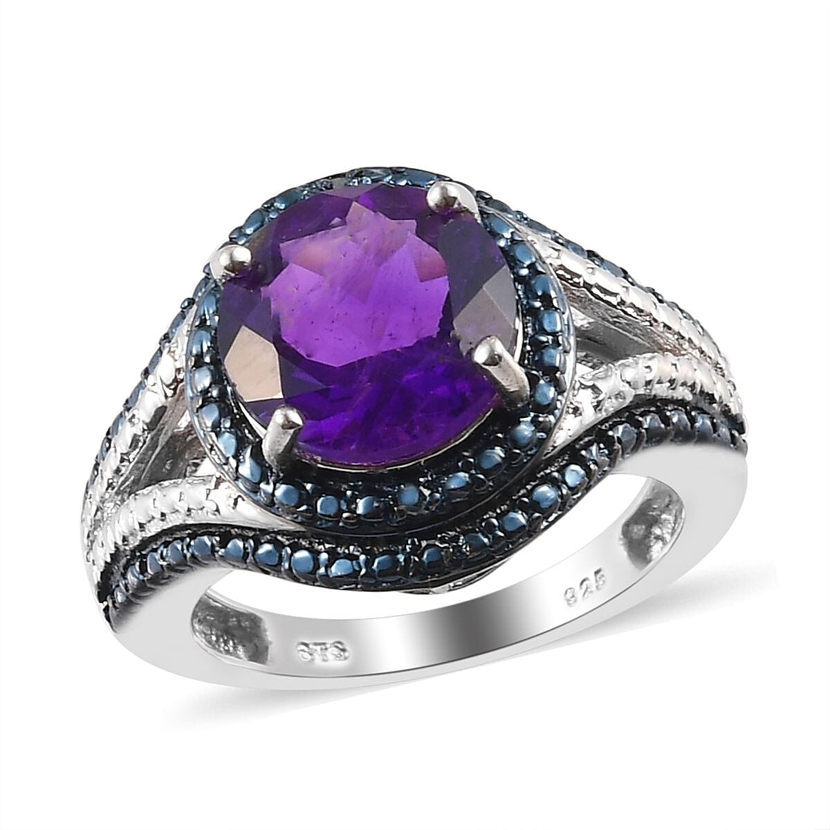 Inspired by an eye, this amethyst ring symbolizes vigilance and intelligence. The accent diamonds on the metal strand of the shank bifurcate and surrounds the center gem. This February birthstone ring is perfect for professional and casual outfits. This gem has a beautiful hue due to the presence of trace amounts of iron and aluminum impurities. The perfect hardness of both the gems makes this ring suitable for everyday wear. Colored diamonds in jewelry are in trend due to their exotic look and elegance, thus making this ring look more beautiful.