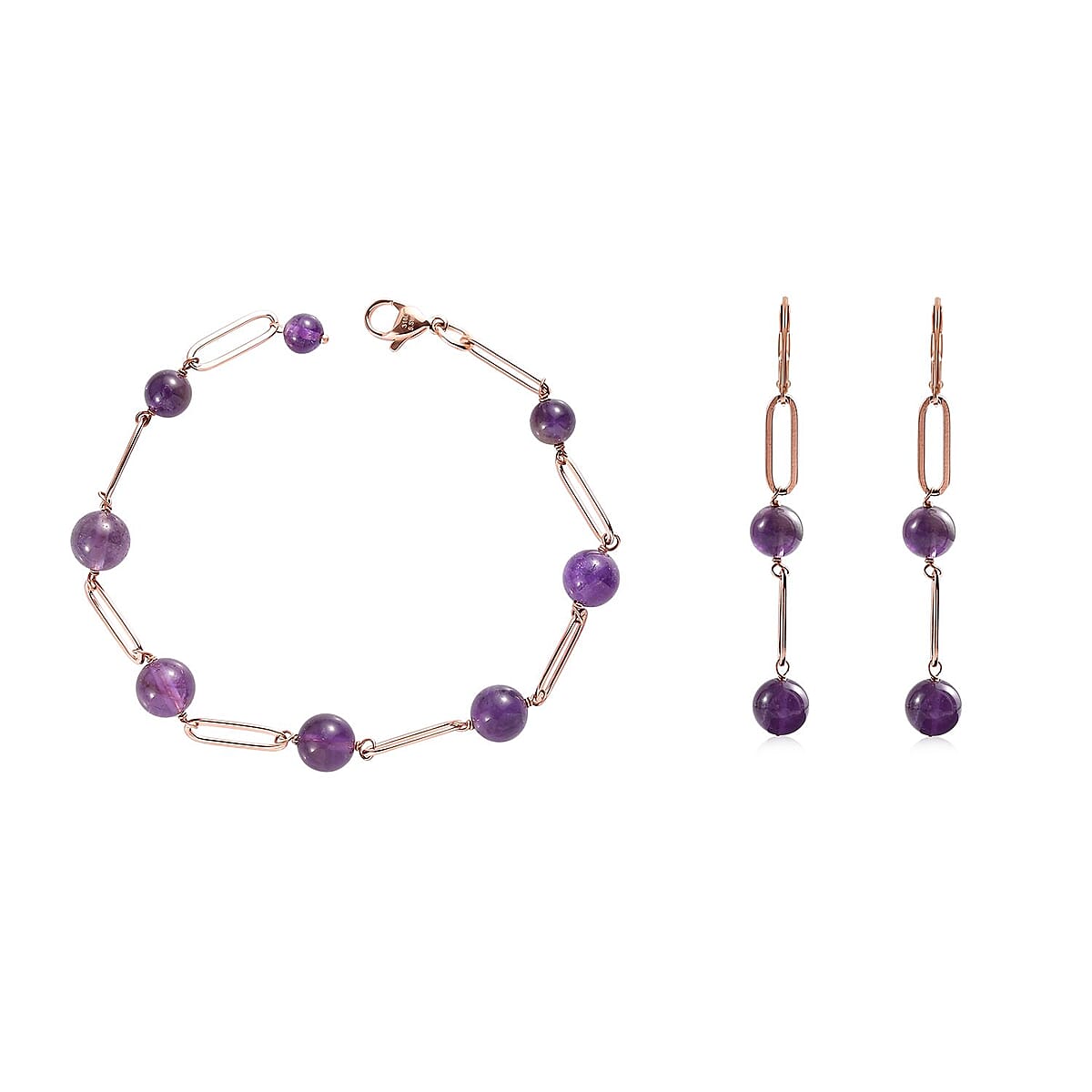 Amethyst Paper Clip Chain Station Bracelet (8In) and Earrings in ION Plated Rose Gold Stainless Steel 32.35 ctw