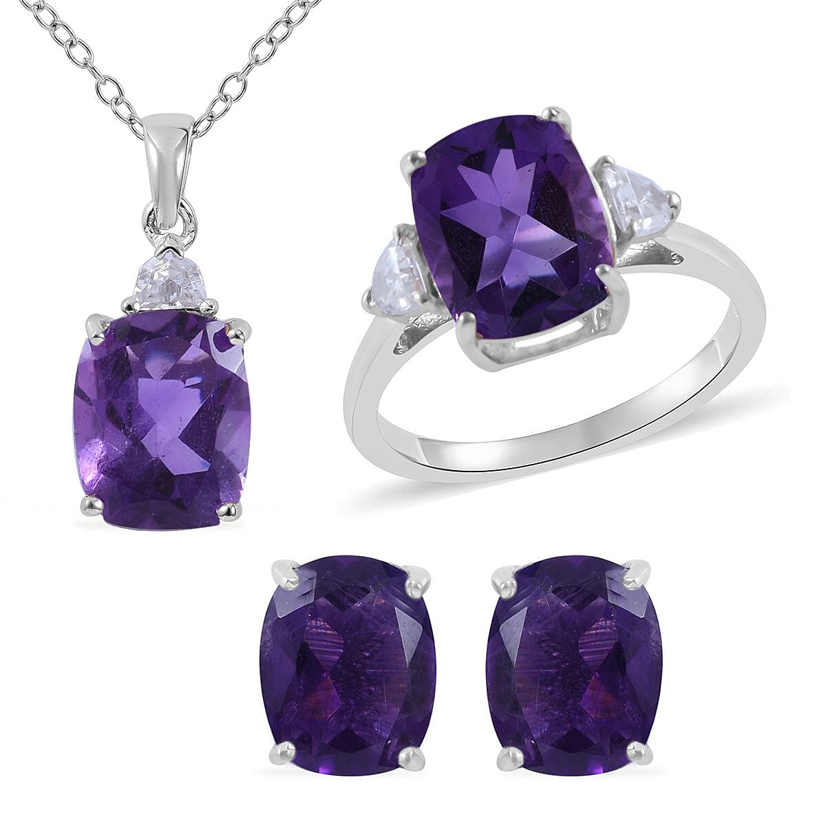 Amethyst, White Zircon Stud Earrings, Ring (Size 11.0) and Pendant Necklace 18 Inches in Platinum Over Sterling Silver 8.40 ctw