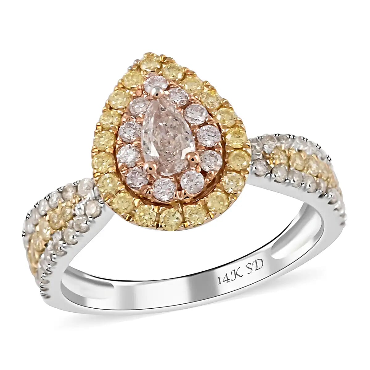 Embrace elegance with this exquisite pink-white-yellow diamond ring. A symphony in 14K tri-tone gold, its teardrop shape and halo ring design radiate unmatched sophistication. Perfect for those who cherish beauty and durability, this 14k tri-tone gold ring is a timeless testament to love and a spectacular statement of style, ideal for any ring for women seeking a fancy ring that's also a durable ring.