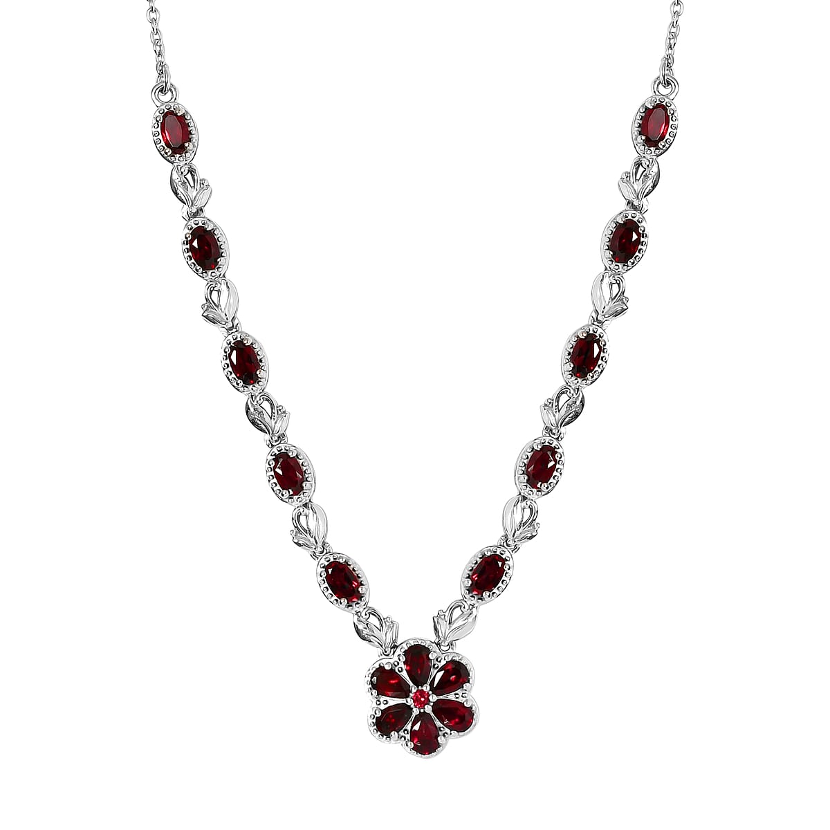 Anthill Garnet Flower Necklace 18 Inches in Platinum Over Sterling Silver 10.15 Grams 4.15 ctw