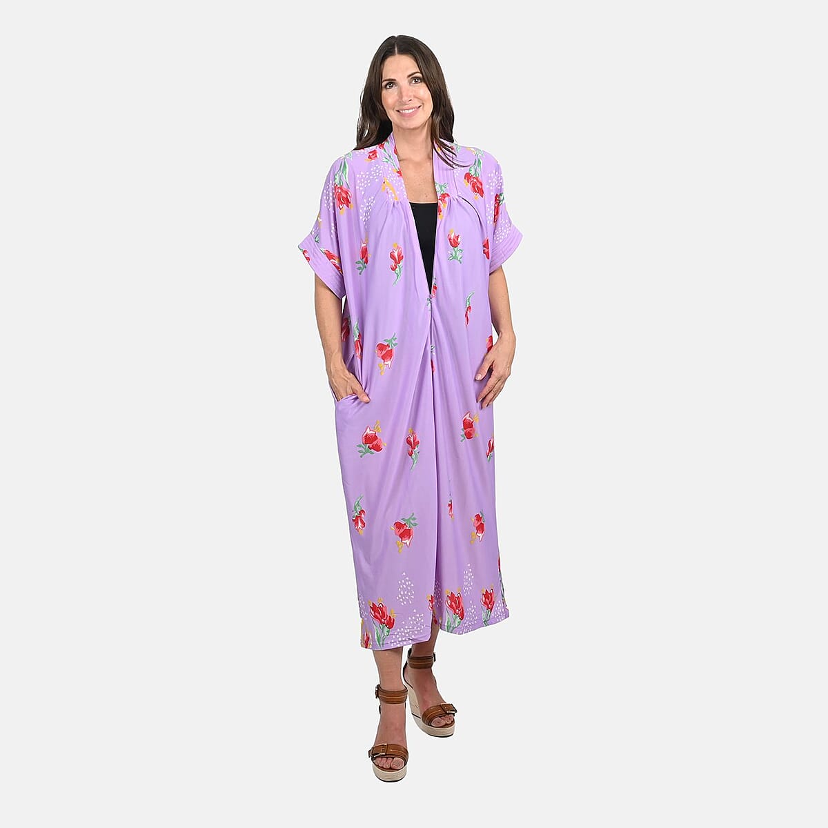 Anthony Richards Lilac Floral Zip Front House Dress, Cotton Machine Washable V neck Short Sleeves Dress For Her - One Size Fits up to XXL