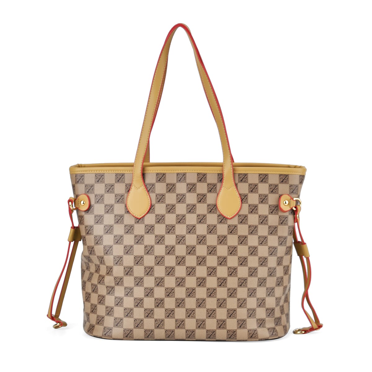 Apricot Color with Brown Checks Print Faux Leather Tote Bag with Apricot Handle
