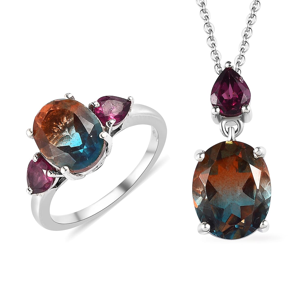 This stunning aqua terra costa quartz (triplet) ring and pendant necklace set is a masterpiece to be owned. The jewelry set features a mesmerizing oval-shaped gemstone highlighted by a pear-shaped Orissa rhodolite garnet. Crafted with sterling silver, the smooth scrolls add a touch of elegance.