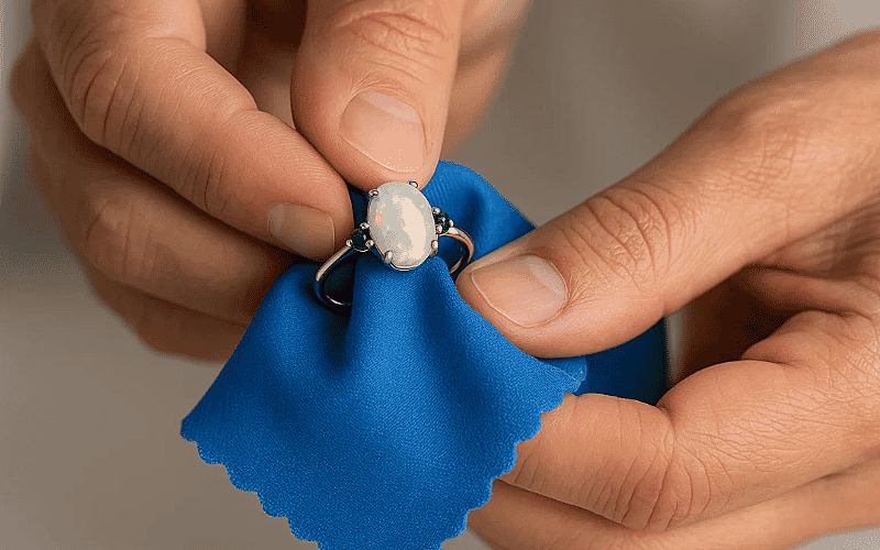 - Opal: To clean opal, use warm soapy water and a soft cloth, but avoid heat or chemicals that could cause cracks. Store opal separately in a soft pouch to prevent scratches from other gems.