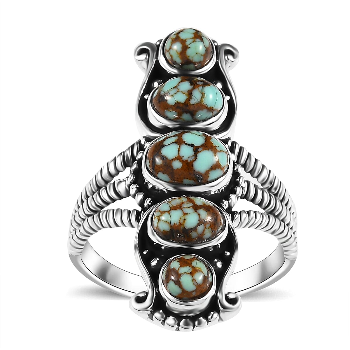 This artisan-crafted blue horizon turquoise ring in sterling silver symbolizes key human values: love, trust, friendship, loyalty, and commitment. The turquoise, selected for its rich blue-green color and unique matrix patterns, creates a striking visual appeal, making this ring a meaningful and stylish choice.