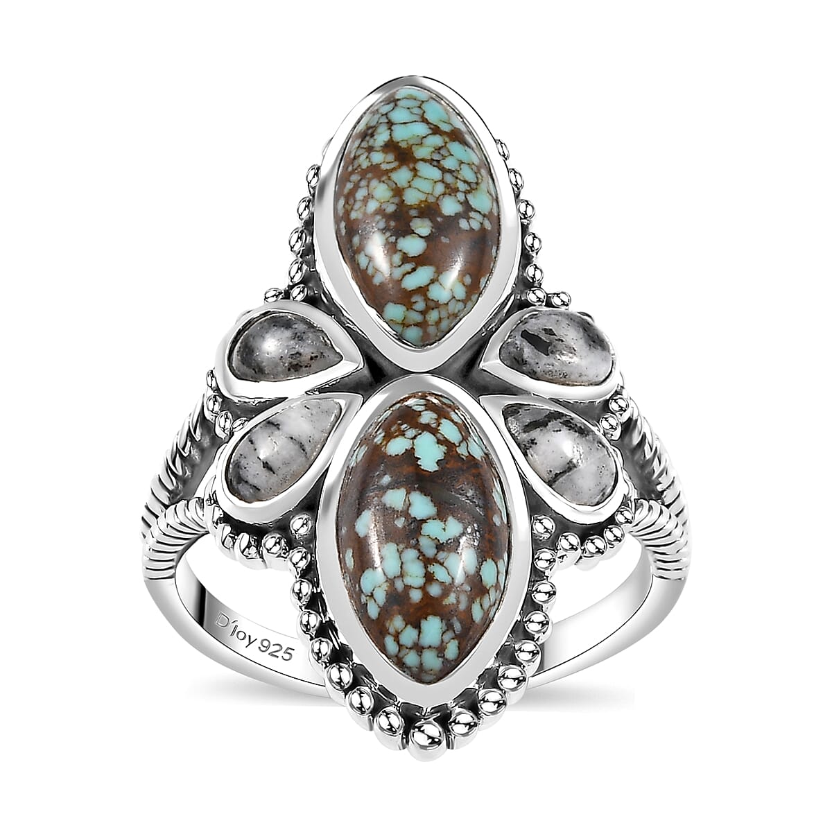 This artisan crafted turquoise with white buffalo ring is set against the backdrop of polished sterling silver. The vibrant turquoise and creamy white buffalo stone complement each other, creating a visually striking contrast. Skillfully crafted, this silver ring merges natural elegance with artistic design, making it an exquisite addition to any jewelry enthusiast's collection.