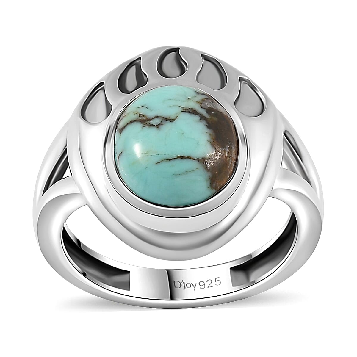 This blue moon turquoise solitaire ring in sterling silver is designed with bear paw inspiration. This blue moon turquoise ring showcases a single turquoise gemstone set in sterling silver bear paw frame. The split shank craftsmanship reflects artisanal skill and attention to detail.