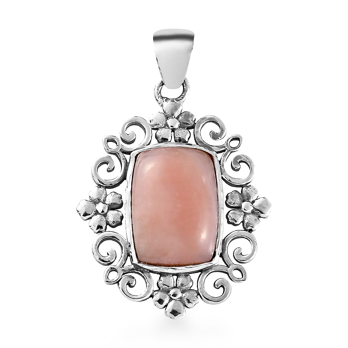 Peruvian Pink Opal pendant is a jewelry piece designed just for you. Laced with a metallic swirl and floral frame and a Peruvian opal solitaire, this pendant in sterling silver features pinkish hues to make you look simply enchanting.