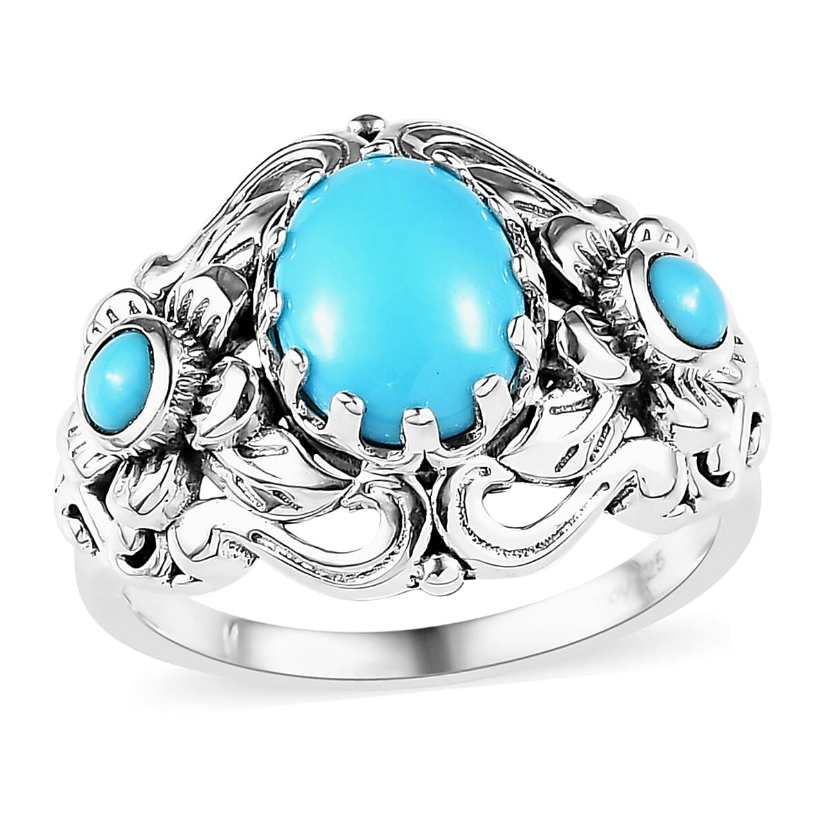 Indulge in a masterpiece of design and artistry with our artisan-crafted premium Sleeping Beauty turquoise ring. A unique blend of floral elegance and symbolic richness, this trilogy ring is more than a piece of jewelry—it’s a story on your finger. Captivating oval and round stones are set in sterling silver, with openwork filigree scrolls that beguile the eyes. It's not just a ring; it's an heirloom, a piece of art, a symbol. It's your new everyday luxury.