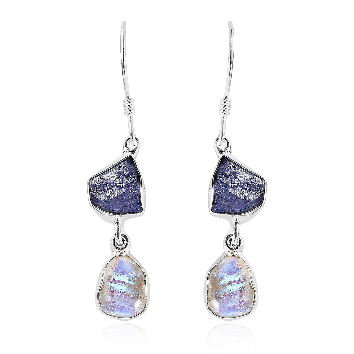 Artisan Crafted Rough Cut Premium Rainbow Moonstone and Tanzanite Fancy Earrings in Sterling Silver 9.60 ctw