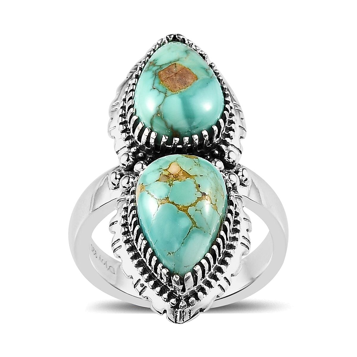 Marvel at the union of two stunning Royston turquoise gemstones in our artisan crafted two-stone ring. Set in sterling silver and featuring an elongated design, the pear-shaped gemstones are inverted to mirror each other, encapsulating balance and harmony. Bezel-set and adorned with artistic metalwork, this piece is an emblem of both artistry and significance.