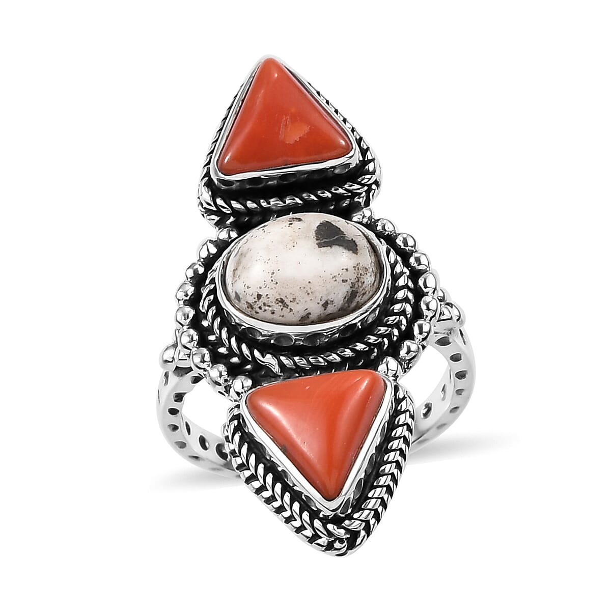 Artisan Crafted White Buffalo and Mediterranean Coral Ring in Sterling Silver (Size 10.0) 4.40 ctw
