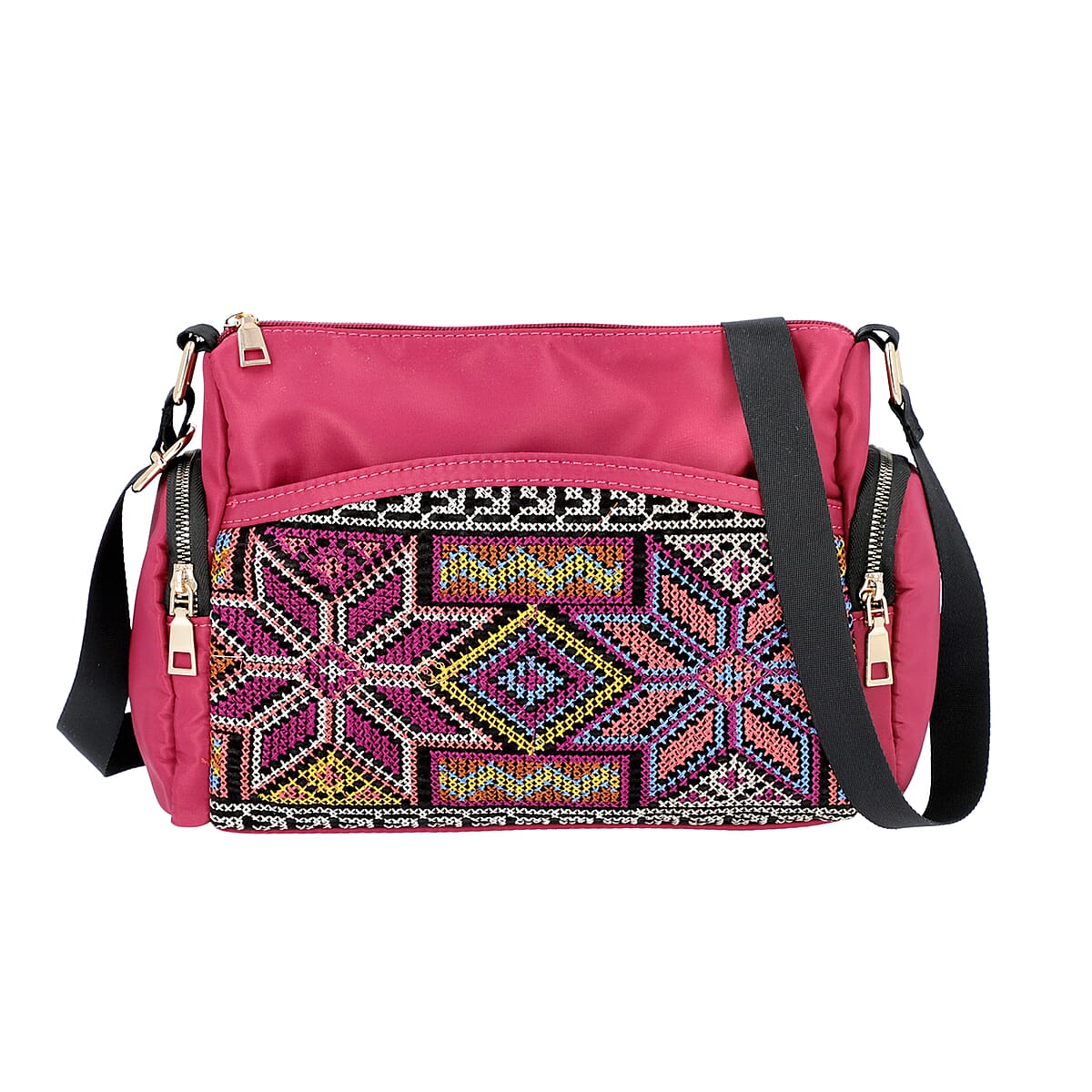 This beautiful cross-body cross-body barrel bag has flawless embroidery all over. This bag is perfect for all seasons. A colorful geometric embroidered design adds to its visual appeal on the bag made by advanced machines.