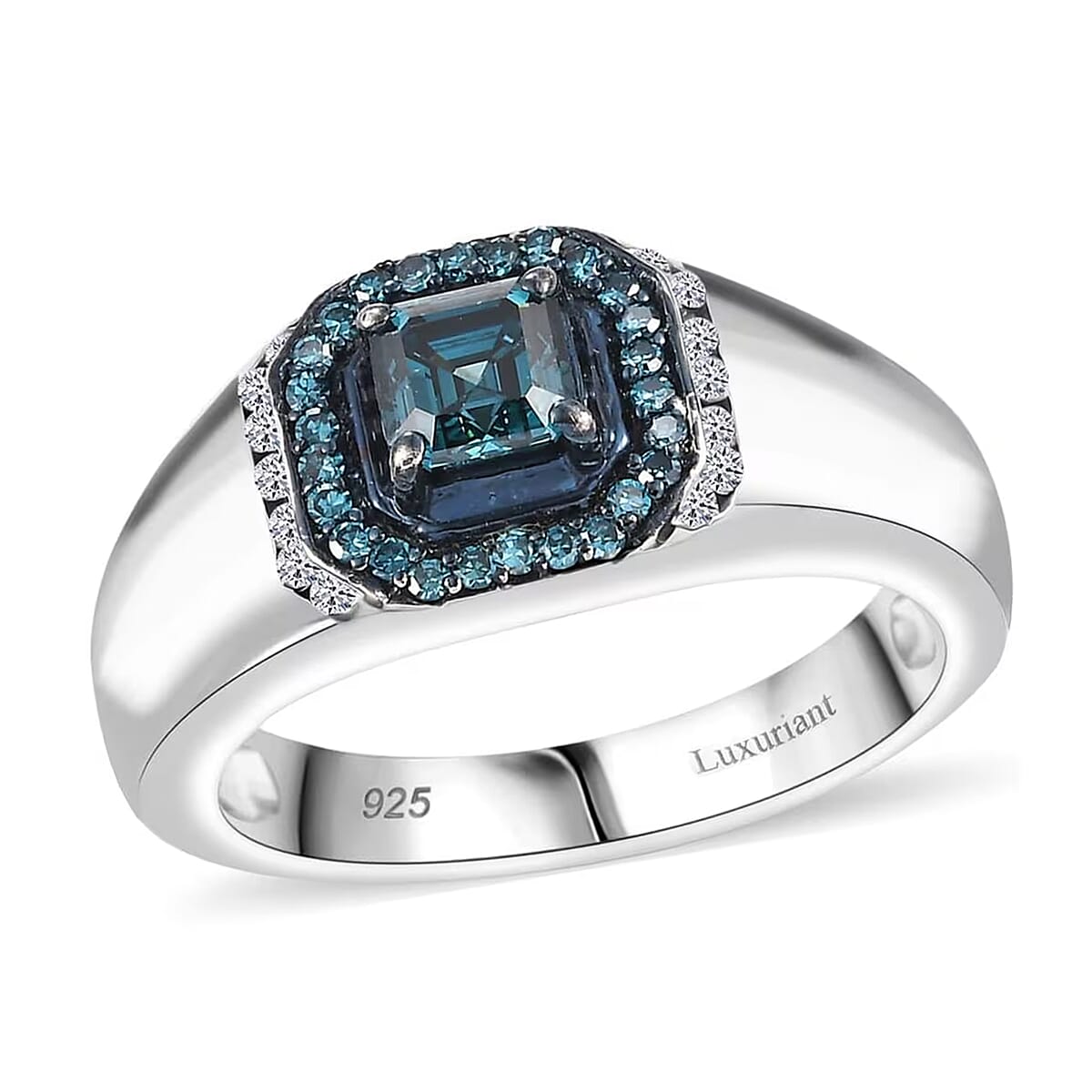Asscher Cut Luxuriant Lab Grown Blue and White Diamond 1.10 ctw Men's Ring in Rhodium Over Sterling Silver (Size 13.0)