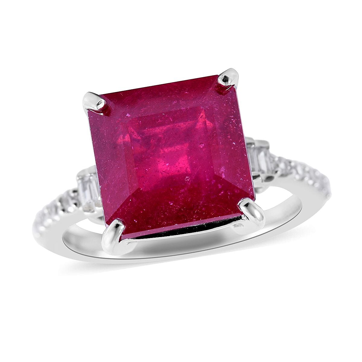 Asscher Cut Niassa Ruby (FF) and White Zircon Ring in Platinum Over Sterling Silver (Size 9.0) 7.65 ctw