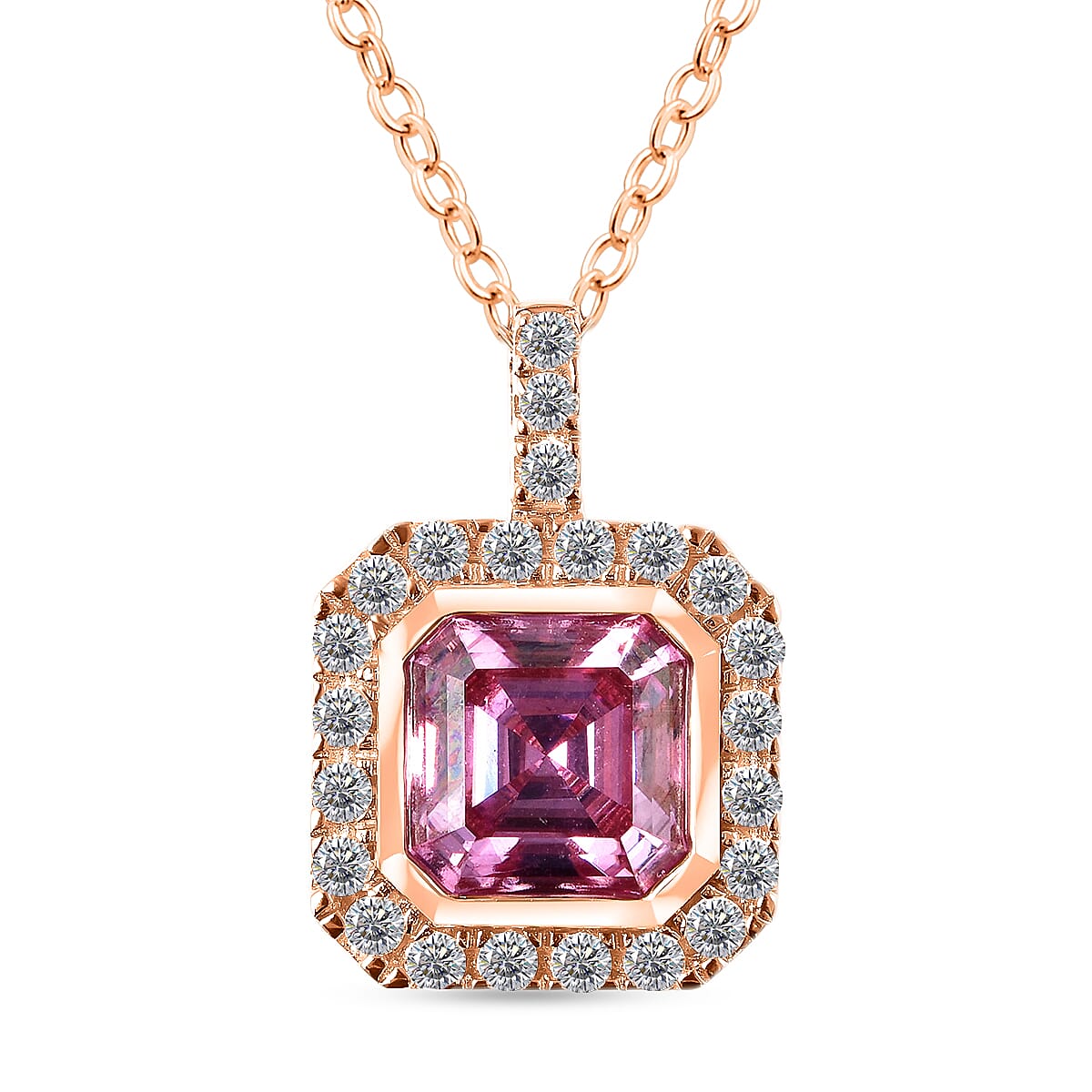 Asscher Cut Pink Moissanite and Moissanite Halo Pendant Necklace 18 Inches in Vermeil Rose Gold Over Sterling Silver 2.00 ctw