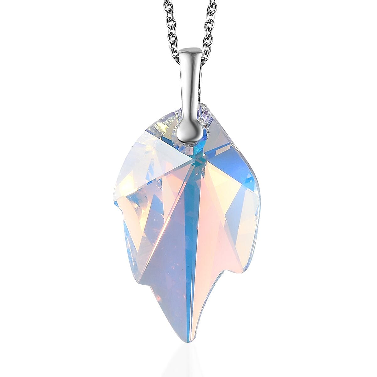 Aurora Borealis Crystal Leaf Pendant in Sterling Silver with Stainless Steel Chain 20 Inches