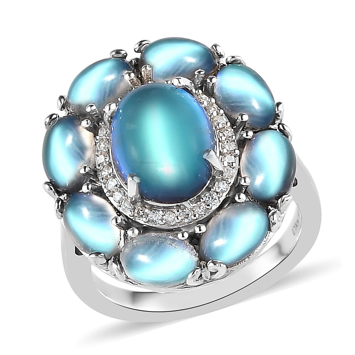 Aurora Moonstone, Natural White Zircon Ring in Platinum Over Sterling Silver (Size 6.0) 7.50 ctw