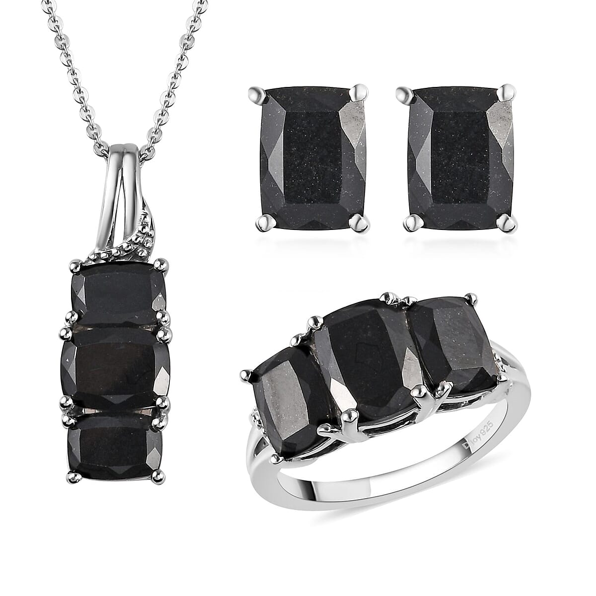 Australian Black Tourmaline 3 Stone Ring SIZE 5.00 Stud Earrings and Pendant Necklace 20 Inches in Platinum Over Sterling Silver 9.60 ctw