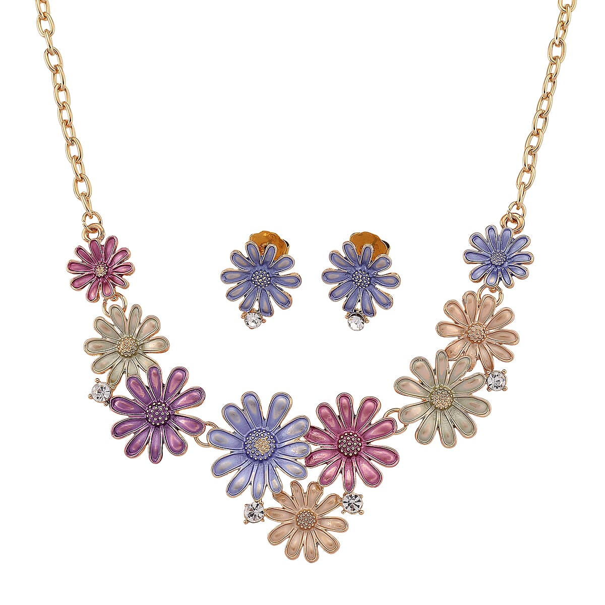 Austrian Crystal, Multi Color Enameled Floral Necklace (20.5-22.5 Inches) and Earrings in Goldtone