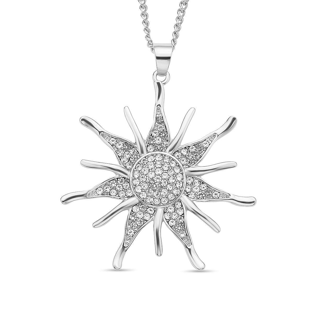 Taking inspiration from the sunburst design, this Austrian crystal sunburst pendant necklace is designed to symbolize life, energy and positivity. Displaying luscious colorless sparkles, this sunburst pendant features a cluster of Austrian crystal in the center as the sun and Austrian crystal studded wavy metallic sun rays all around. A sunburst is a pattern or design that resembles the sun with rays coming from it. Sunburst symbolizes that life is everlasting. This sunburst pendant necklace is framed in silvertone-plated brass and features 29 inches of rope length. Austrian crystal is handmade using a technique traditionally known for cutting hand-blown glass. This Austrian crystal pendant necklace features a lobster clasp with an extender chain.