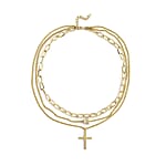 Austrian Crystal Three Layered Necklace with Cross Charm (20.5-22.5 Inches) in Goldtone 6.00 ctw