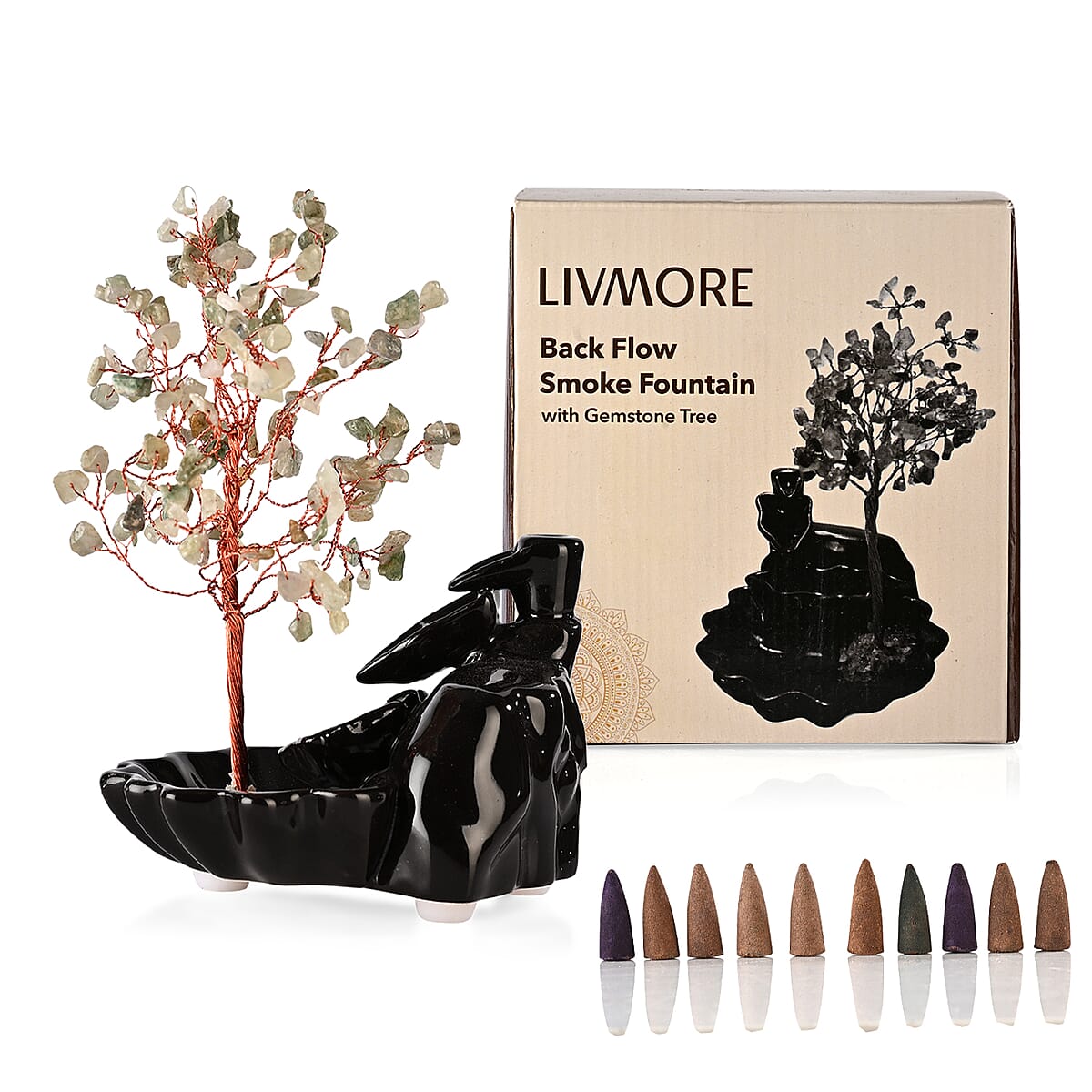 Backflow Incense Burner with Green Aventurine Tree Back Flow Incense Holder with 30 Incense cones Tree - 150 Beads