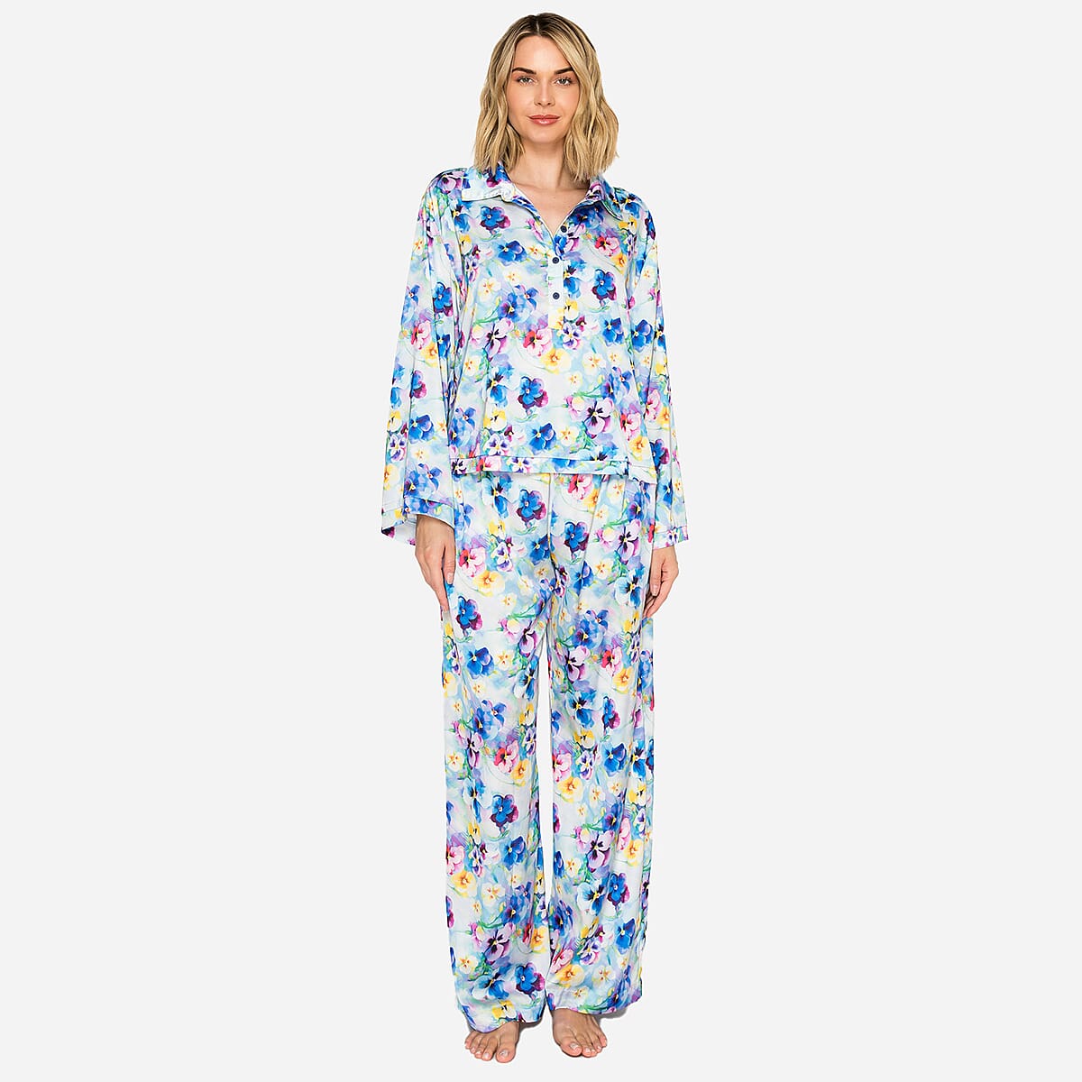 Badgley Mischka Blue Floral Satin Button up Pajama Set - M
