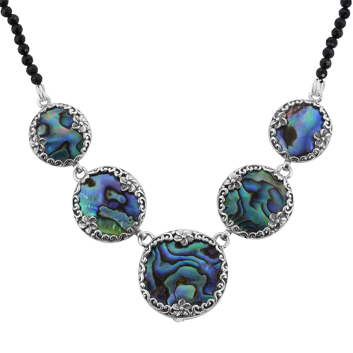 Bali Legacy Abalone Shell Pendant with Thai Black Spinel Beaded Necklace 20 Inches in Sterling Silver 50.00 ctw