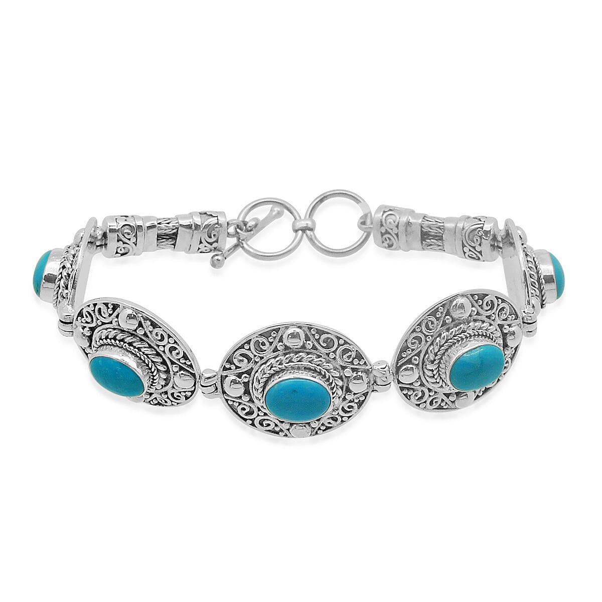 Inspired by the distinctive culture of Balinese and Javanese people, this Bali legacy American natural sleeping beauty turquoise bracelet gives an aesthetic appearance with its exceptional artistry. Contemporary artwork symbolizes culturally diverse designs. The turquoises are embellished in a symmetrical row with intricate metal details on the contours. Sleeping beauty turquoise is the only variety that is found without veining on the surface, highlighting the smooth texture with subtle blue hues. The twisted strand of the metal designs the frame of the bracelet. This Bali Legacy bracelet is crafted in sterling silver, sustaining the stylish appeal of the bracelet. The toggle clasp offers comfort fit with a firm grip. Bali Legacy collection offers designs with intricate details highlighting the exotic culture of Balinese people.