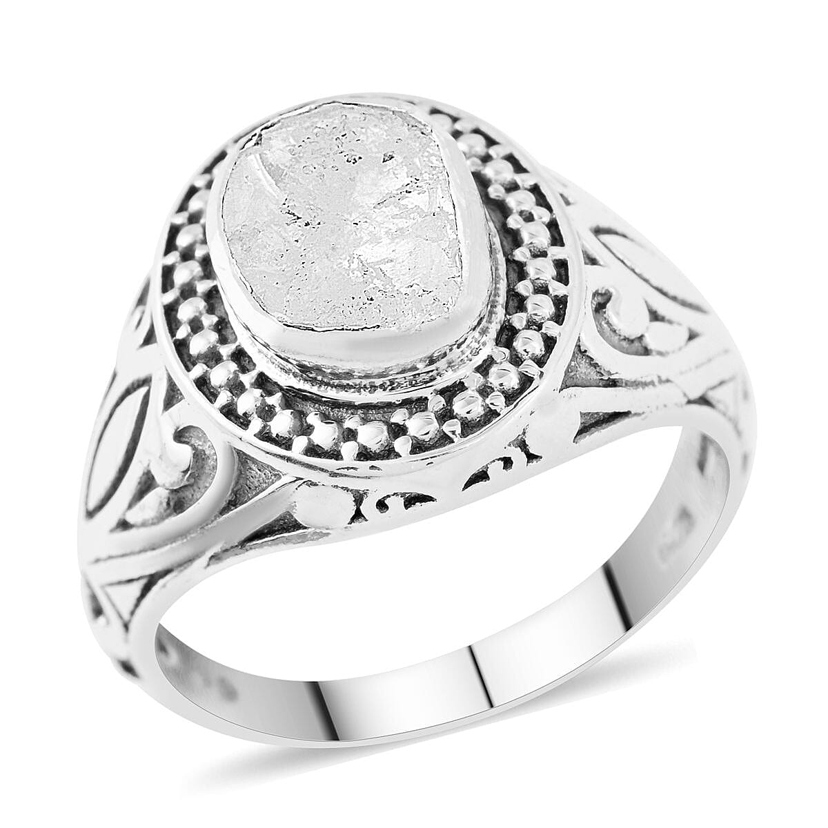 Inspired by a solitaire theme, this polki diamond ring signifies love forever. This ring features a rough cut, unpolished gem in the center highlighted by an array of metal beads giving an illusion of a halo design. The shank displays the beauty of metal artwork inspired by the motifs on the walls of temples. Holding a rough-cut gem in any setting lays high precision, thus adding more effort to bring out the best symmetrical and well-organized look to the piece. Solitaire rings are the perfect gift for weddings and anniversaries as they deliver a timeless and classy appeal. Bali Legacy designs are coveted for their distinct look and carry the beauty of Bali culture and tradition. Each Bali Legacy piece is handcrafted and made using hand-held ancient tools each reflecting the precision and time this adornment takes to develop into a beautiful piece of art. Crafted in sterling silver, this ring suits all outfits.