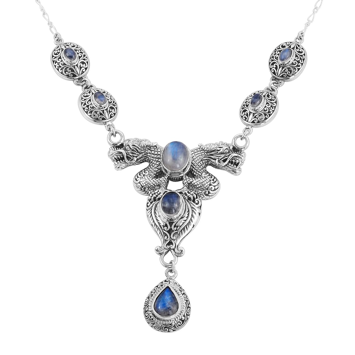 Bali Legacy Premium Rainbow Moonstone Dragon Necklace 20 Inches in Sterling Silver 12.60 ctw