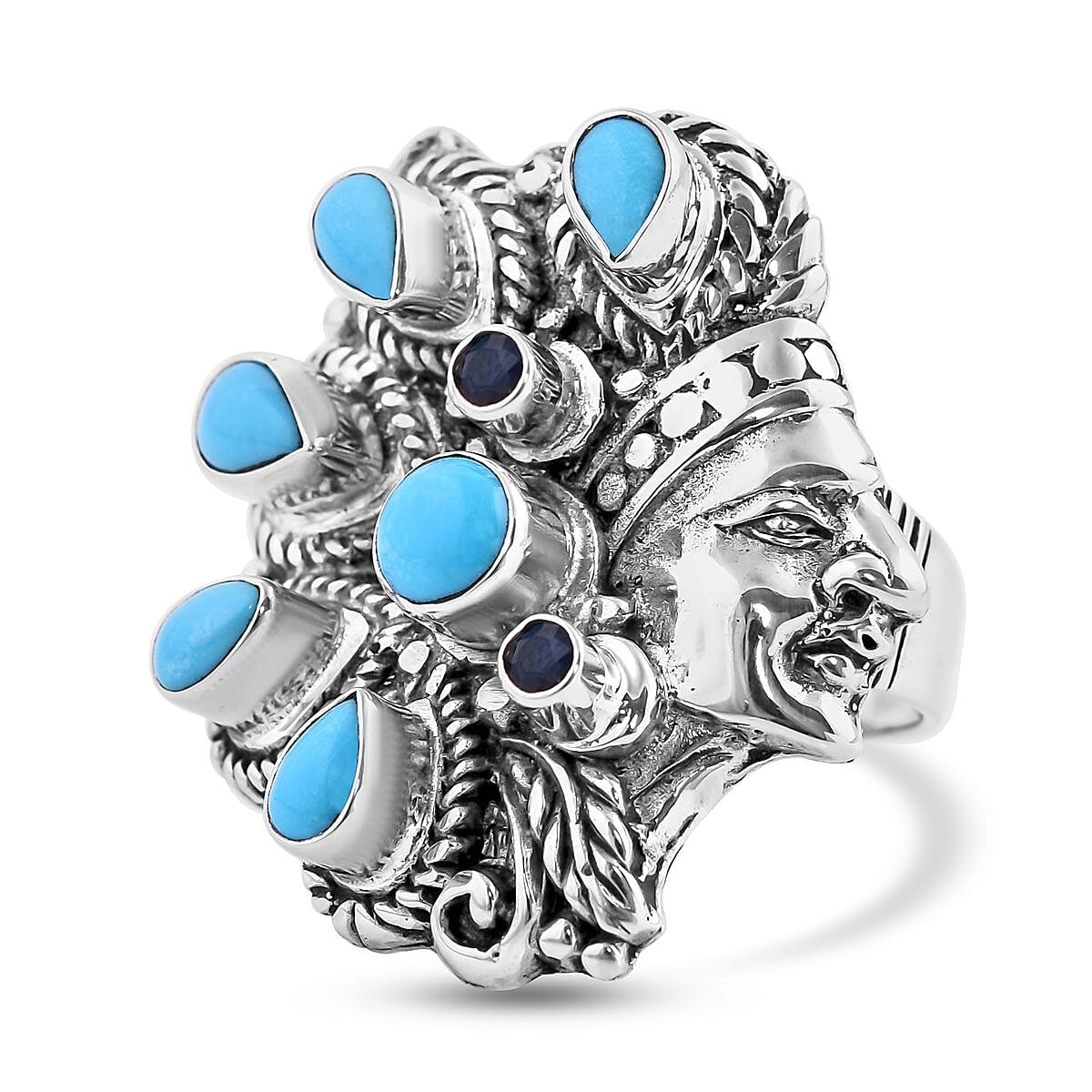 Bali Legacy Sleeping Beauty Turquoise and Blue Sapphire Native American Chief Ring in Sterling Silver (Size 8.0) 3.30 ctw