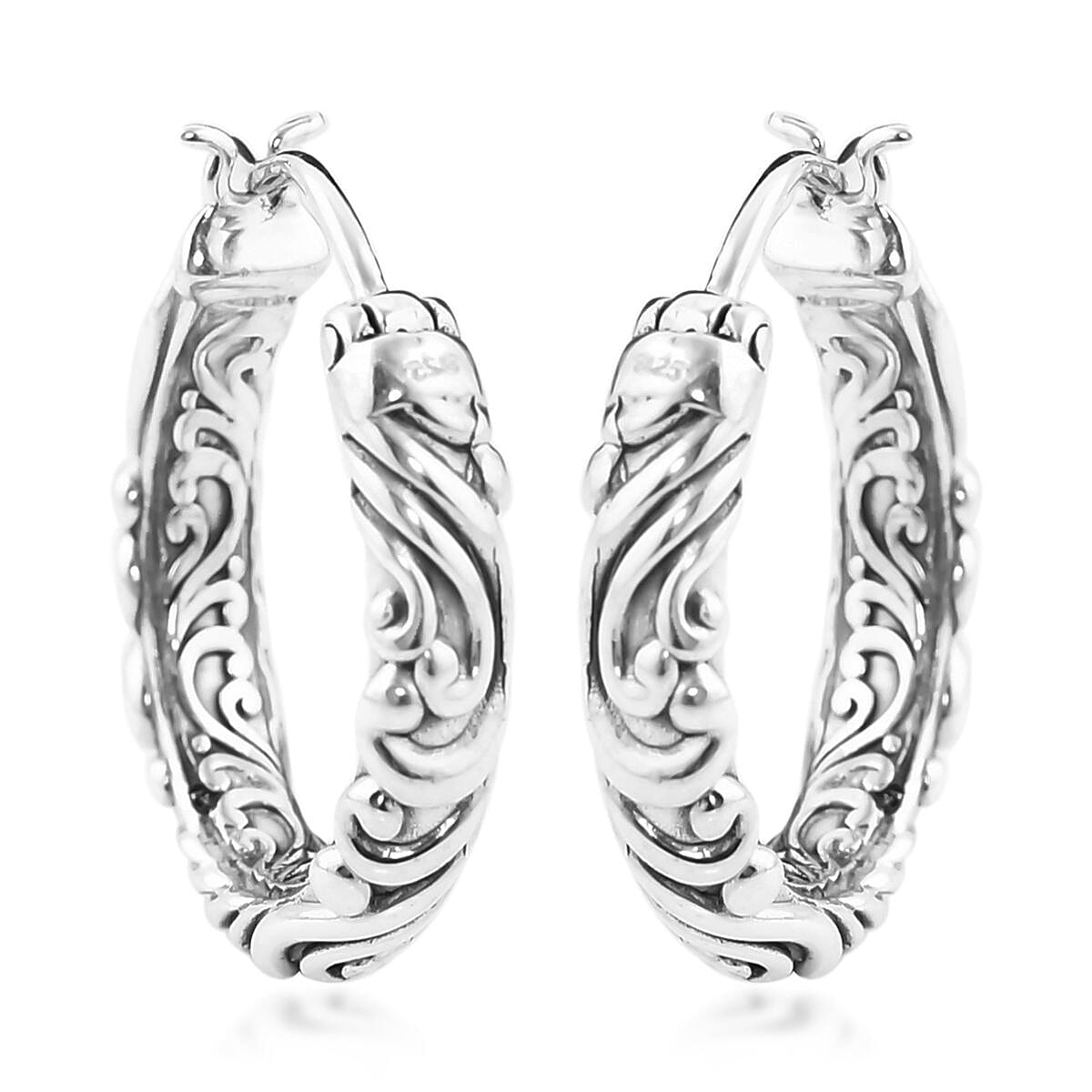 The Bali Legacy hoop earrings in sterling silver are a sophisticated accessory for women, symbolizing eternity and featuring Bali's fine handcraftsmanship with an engraved surface design. Crafted with durable and hypoallergenic sterling silver, these earrings have hinged hoop clasps for easy wear.