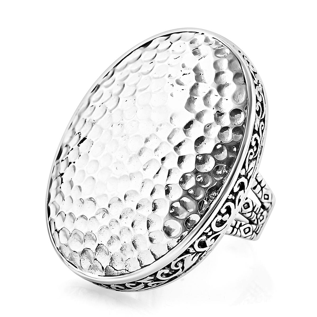 Elevate your style with the exquisite Bali Legacy sterling silver ring. Crafted with precision, this Balinese ring features a hammered texture oval-shaped center and scroll metalwork under bridge. The split shank boasts intricate metalwork, adding a touch of artistry to any ensemble.