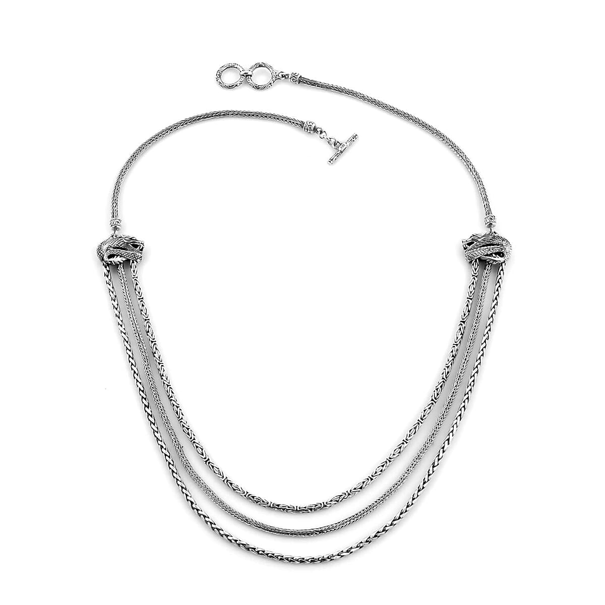 Bali Legacy Sterling Silver Toggle Clasp Dragon Three Strand Tulang Naga, Padian and Borobudur Necklace 20 Inches 52 Grams