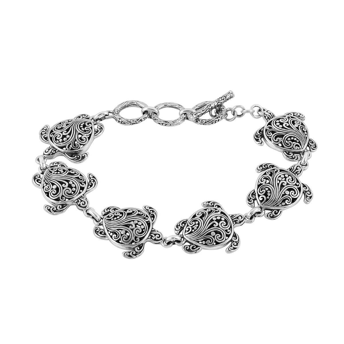 Animal motif inspires the design of this Bali legacy turtle bracelet. Metal strands are twisted to design a linear loop of turtles with intricate patterns. This bracelet is designed in sterling silver. The metal frame is hypoallergenic and adorns the bracelet with a luminous appeal. Toggle clasp adorns the bracelet with a dash of aesthetic style and offers a secure closure. Bali Legacy speaks vividly about the rich culture of Balinese and Javanese people, giving an innovative twist to the jewelry designs.