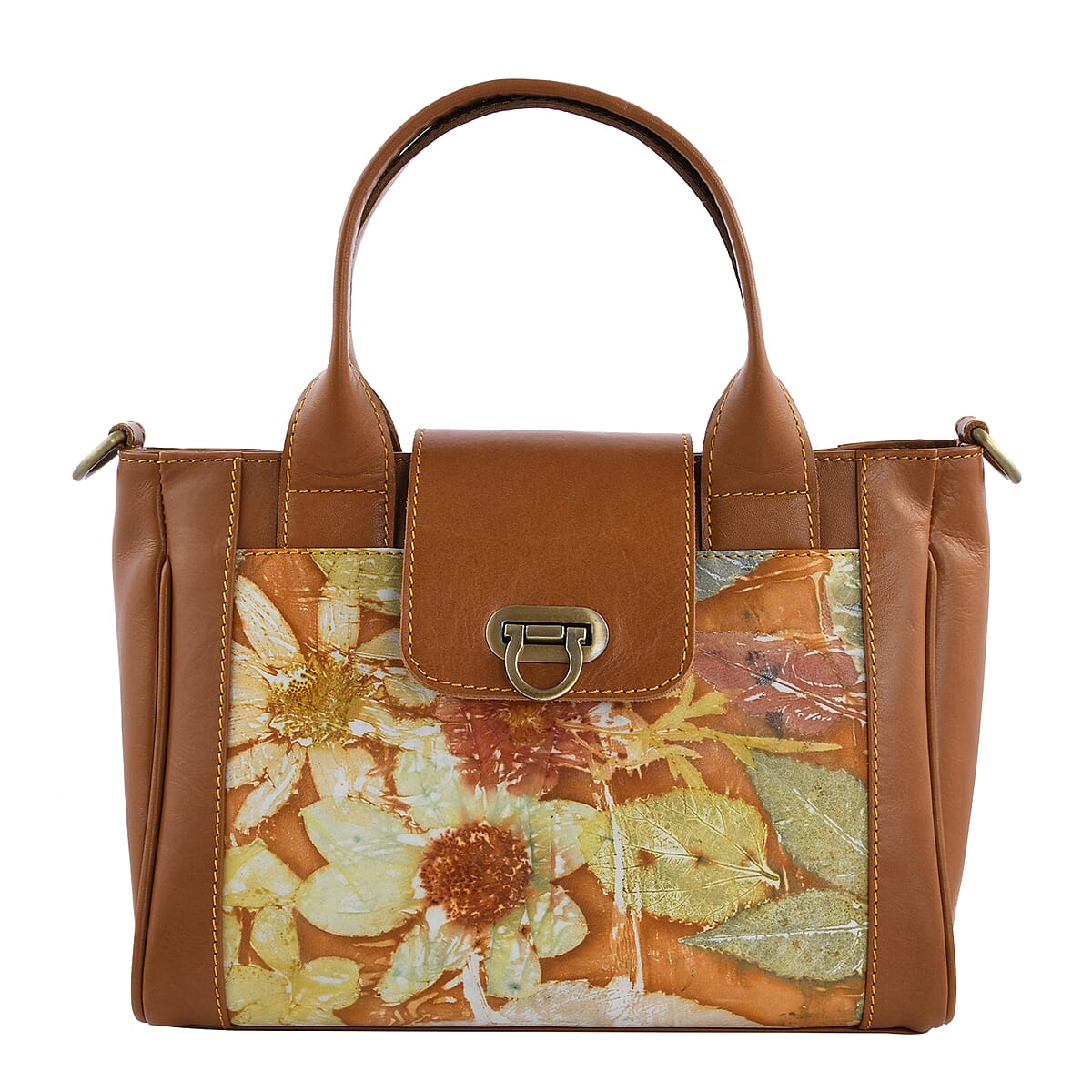 Bali Pristine Collection, Handmade Brown Flower and Leaf Eco Print Genuine Cow Leather Briona Bag with Detachable and Adjustable Shoulder Strap